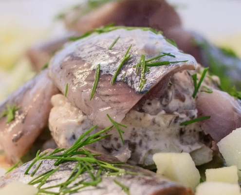 Ostermenü - Weißes Osterkörbchen mit lila, blauen, und hellblauen Eiern, dazu Blätter als DekorationSilvia auf Pixabay